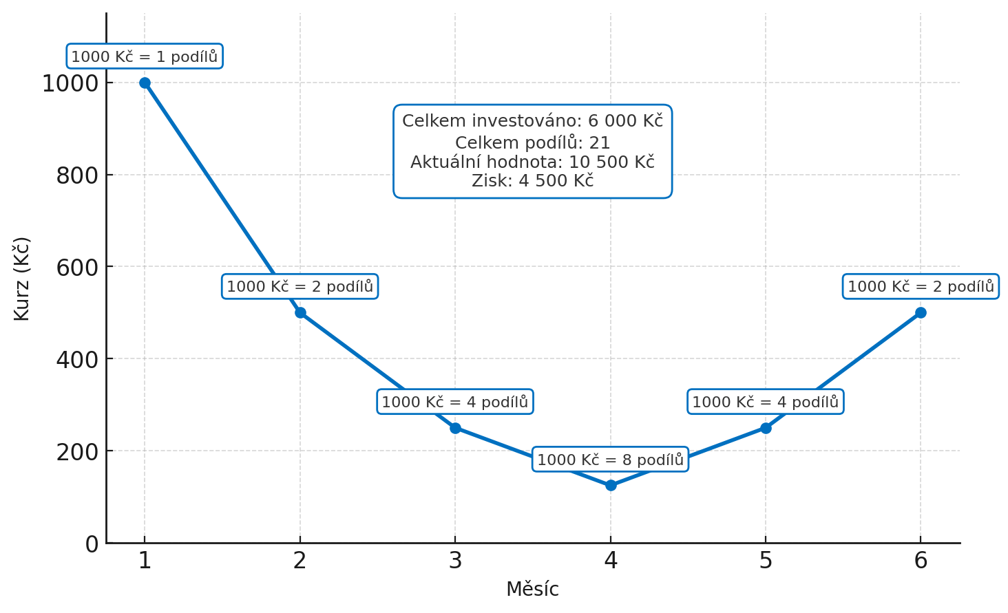 Pravidelná investice přináší průměrování ceny. Při poklesu trhů za stejnou částku nakoupíte více jednotek, při růstu méně. Díky tomu dlouhodobě dosahujete nižší průměrné nákupní ceny, než při jednorázové investici na vrcholu a snižujete tak riziko špatného načasování.